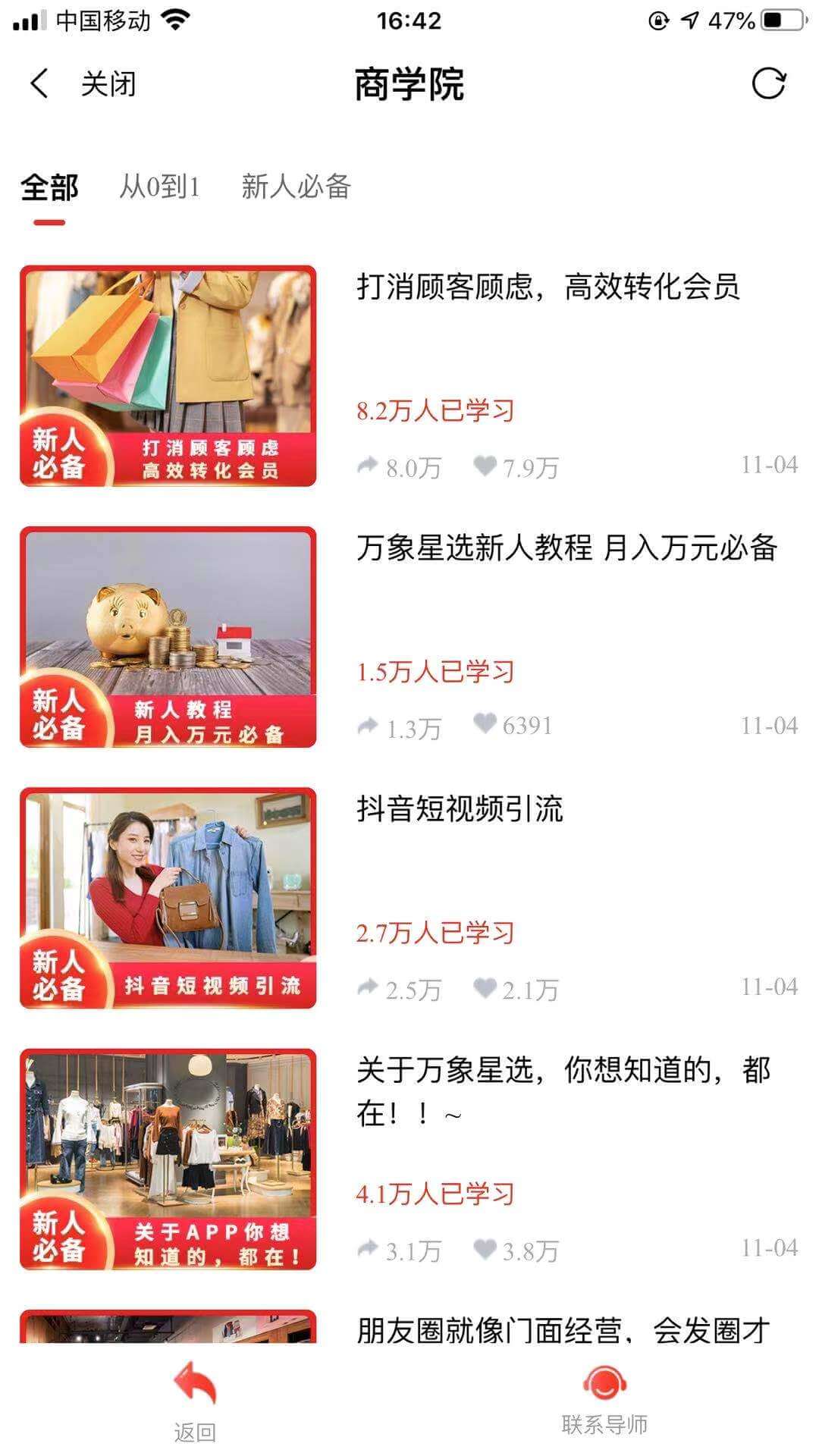 平台邀请了多位社交电商行业实战经验丰富的营销专家,为大家精心打造多层次、全方位的营销推广课程,如:新人入门、高手进阶、引流技巧,地推专栏等,致力于帮助广大大家在社交电商浪潮中创业致富!